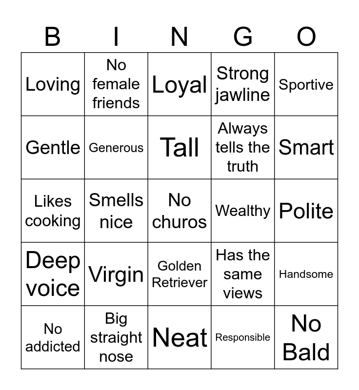 This bingo card has a free space and 24 words: Virgin, Big straight nose, Tall, No addicted, Sportive, Loving, Gentle, No female friends, Wealthy, Golden Retriever, Always tells the truth, Likes cooking, Has the same views, Handsome, Generous, Responsible, Polite, Loyal, Smart, Smells nice, No Bald, Deep voice, Strong jawline and Neat.