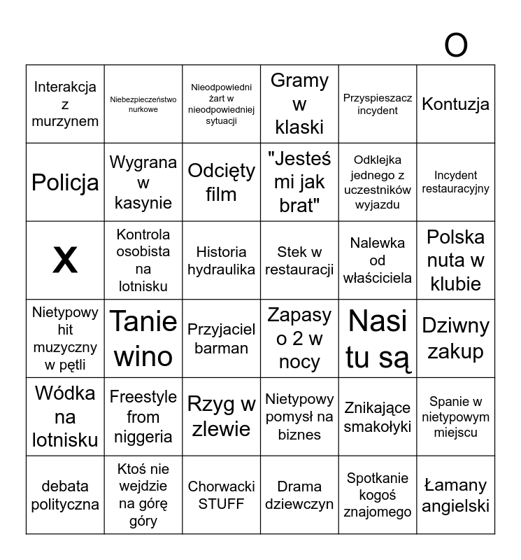 This bingo card has 36 words: Nietypowy pomysł na biznes, Rzyg w zlewie, Drama dziewczyn, Policja, Nietypowy hit muzyczny w pętli, Stek w restauracji, Wygrana w kasynie, Chorwacki STUFF, Przyspieszacz incydent, Znikające smakołyki, Incydent restauracyjny, Gramy w klaski, Spanie w nietypowym miejscu, Kontrola osobista na lotnisku, "Jesteś mi jak brat", Interakcja z murzynem, Wódka na lotnisku, Nalewka od właściciela, X, Nieodpowiedni żart w nieodpowiedniej sytuacji, Historia hydraulika, Tanie wino, Zapasy o 2 w nocy, Przyjaciel barman, Nasi tu są, Niebezpieczeństwo nurkowe, Odklejka jednego z uczestników wyjazdu, Ktoś nie wejdzie na górę góry, Odcięty film, Kontuzja, Łamany angielski, debata polityczna, Dziwny zakup, Polska nuta w klubie, Freestyle from niggeria and Spotkanie kogoś znajomego.
