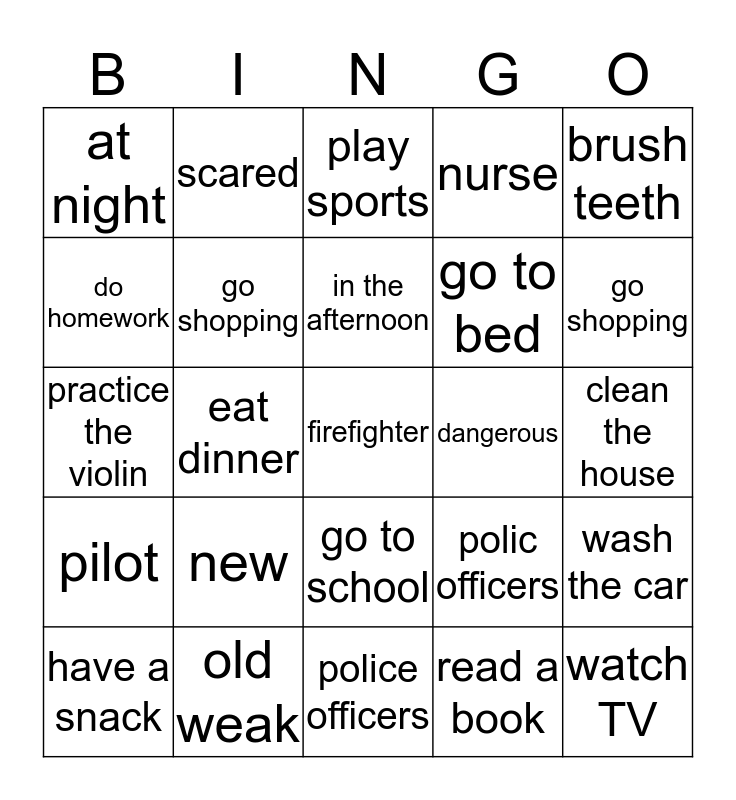 This bingo card has a free space and 24 words: new, old weak, in the afternoon, have a snack, brush teeth, at night, do homework, scared, dangerous, go to school, go to bed, practice the violin, polic officers, wash the car, go shopping, read a book, clean the house, play sports, go shopping, eat dinner, watch TV, pilot, nurse and police officers.