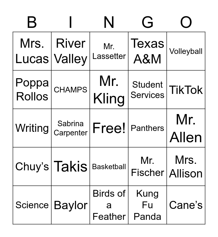 This bingo card has a free space and 28 words: Mrs. Allison, Coach Allen, Student Services, Kung Fu Panda, Poppa Rollos, Mr. Lassetter, River Valley, Chuy’s, Panthers, Science, Writing, Texas A&M, Baylor, Birds of a Feather, TikTok, Swifties, Takis, CHAMPS, Mr. Kling, Basketball, Mrs. Lucas, Crumbl, Cane’s, Sabrina Carpenter, Mr. Allen, Mr. Fischer, Volleyball and Kendrick Lamar.