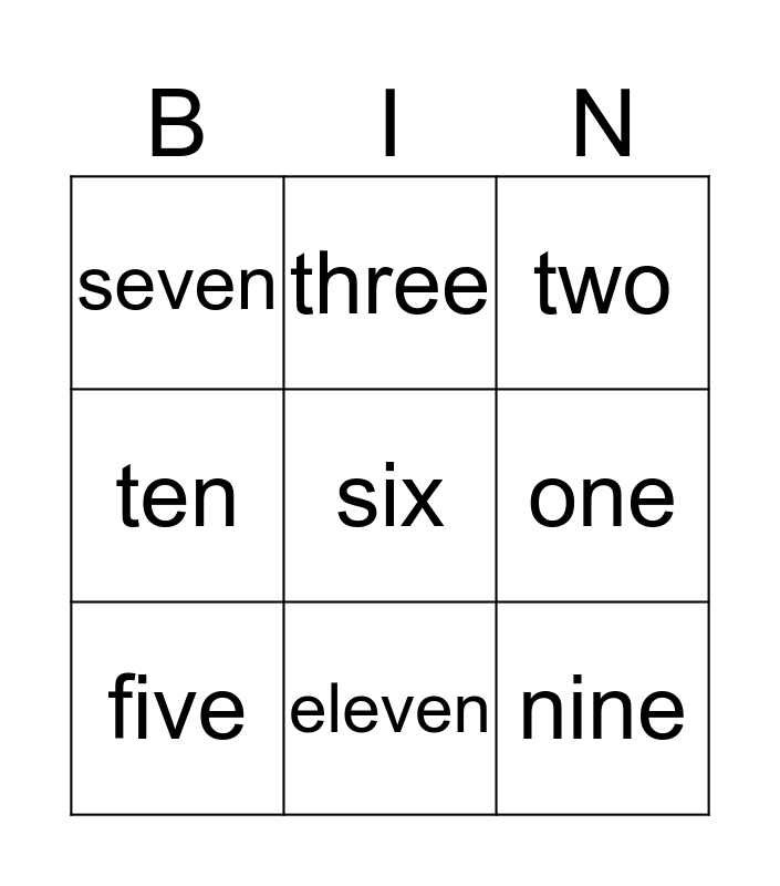This bingo card has a free space and 8 words: one, two, three, five, seven, nine, ten and eleven.