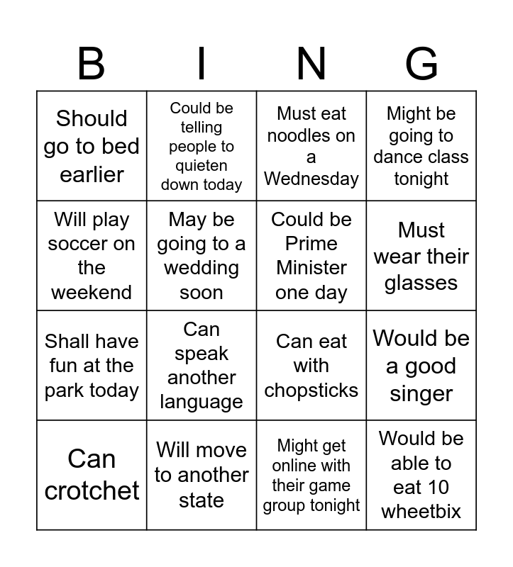 This bingo card has 16 words: Can crotchet, Will move to another state, Must eat noodles on a Wednesday, Might be going to dance class tonight, Will play soccer on the weekend, Could be telling people to quieten down today, Can eat with chopsticks, Would be a good singer, Should go to bed earlier, May be going to a wedding soon, Might get online with their game group tonight, Must wear their glasses, Shall have fun at the park today, Can speak another language, Could be Prime Minister one day and Would be able to eat 10 wheetbix.