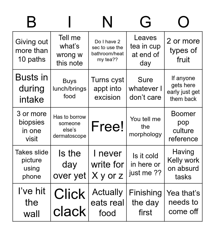 This bingo card has a free space and 24 words: Is the day over yet, Click clack, Turns cyst appt into excision, I’ve hit the wall, 2 or more types of fruit, Giving out more than 10 paths, Busts in during intake, Tell me what’s wrong w this note, You tell me the morphology, I never write for X y or z, Sure whatever I don’t care, 3 or more biopsies in one visit, Is it cold in here or just me ??, Having Kelly work on absurd tasks, Buys lunch/brings food, Finishing the day first, Boomer pop culture reference, Do I have 2 sec to use the bathroom/heat my tea??, If anyone gets here early just get them back, Has to borrow someone else’s dermatoscope, Yea that’s needs to come off, Takes slide picture using phone, Leaves tea in cup at end of day and Actually eats real food.