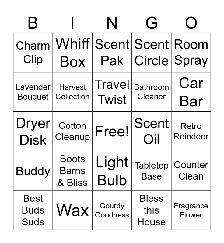 This bingo card has a free space and 26 words: Mini Fan Diffuser, Boots Barns & Bliss, Gourdy Goodness, Bless this House, Car Bar, Charm Clip, Whiff Box, Scent Pak, Bathroom Cleaner, Counter Clean, Dryer Disk, Cotton Cleanup, Tabletop Base, Fragrance Flower, Buddy, Scent Pod, Travel Twist, Scent Oil, Room Spray, Best Buds Suds, Harvest Collection, Light Bulb, Scent Circle, Retro Reindeer, Lavender Bouquet and Wax.