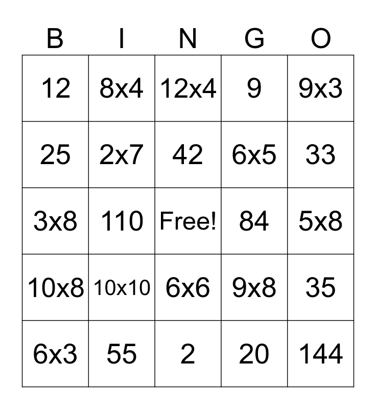 This bingo card has a free space and 24 words: 10x10, 55, 42, 6x3, 9x3, 12, 25, 8x4, 84, 6x6, 6x5, 3x8, 9x8, 35, 2x7, 20, 5x8, 12x4, 33, 110, 144, 10x8, 9 and 2.