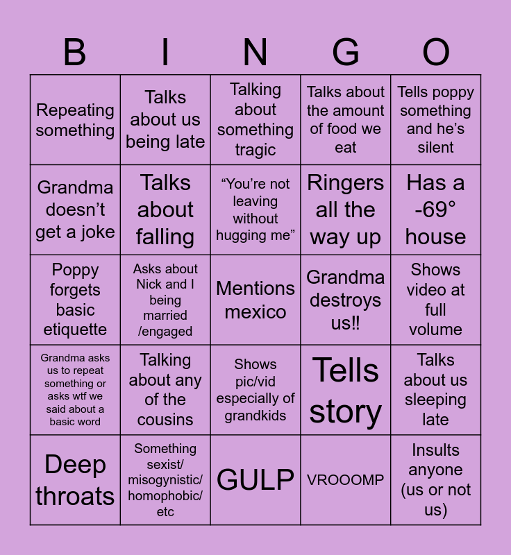 This bingo card has a free space and 29 words: Deep throats, Says something about jobs, Asks about Nick and I being married /engaged, Yaps, Repeating something, Talking about something tragic, Talks about falling, Talking about any of the cousins, Grandma destroys us‼️, Something sexist/ misogynistic/ homophobic/ etc, Shows video at full volume, Insults anyone (us or not us), GULP, VROOOMP, Has a -69° house, Wants Nicole, Shows pic/vid especially of grandkids, Grandma asks us to repeat something or asks wtf we said about a basic word, Tells poppy something and he’s silent, Poppy forgets basic etiquette, Tells story, Poppy WAY over explains, Ringers all the way up, Grandma doesn’t get a joke, Talks about the amount of food we eat, Talks about us being late, Talks about us sleeping late, “You’re not leaving without hugging me” and Awkward hug.