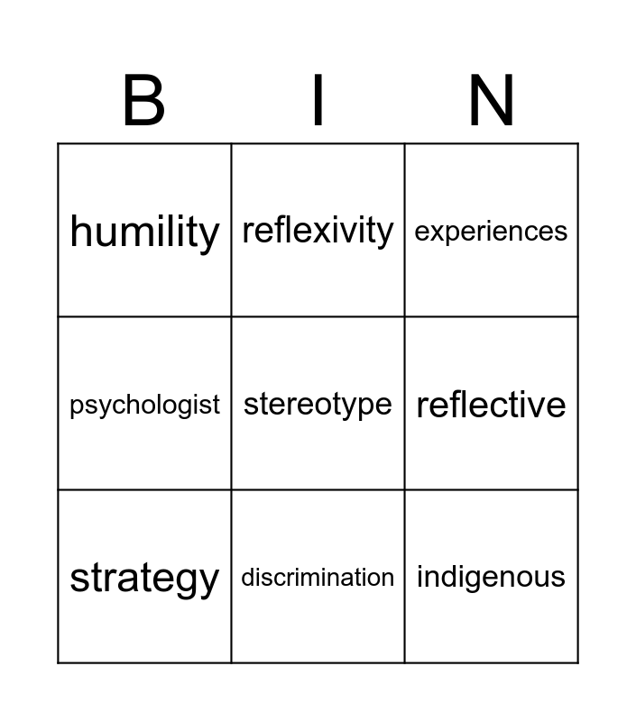 This bingo card has 22 words: culture, safe, reflexivity, collaboration, reflective, strategy, humility, experiences, population, biopsychosocial, indigenous, psychologist, clinical, historical, minority, assessment, disadvantage, impact, intervention, stereotype, discrimination and bias.