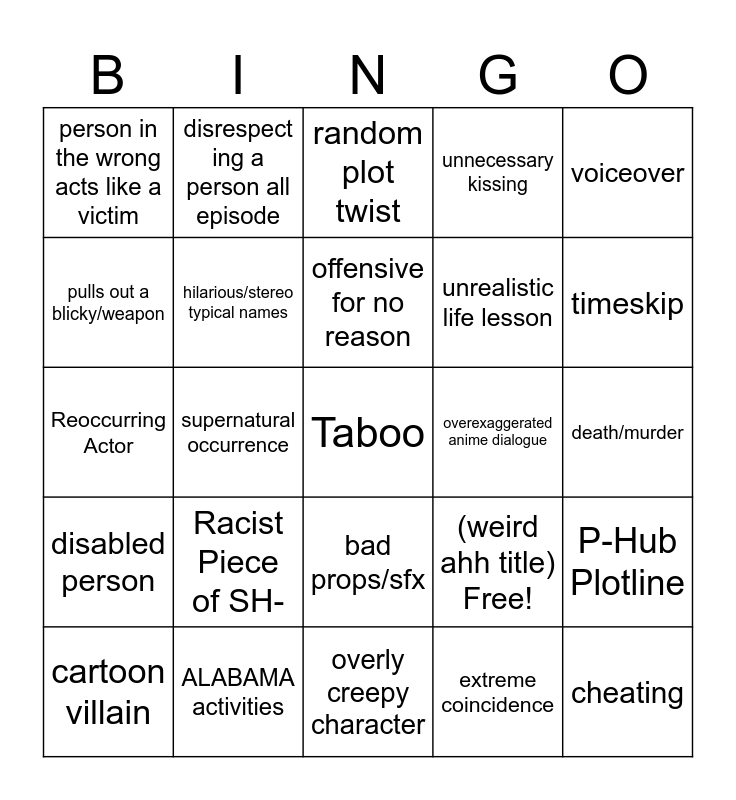 This bingo card has 25 words: Racist Piece of SH-, overly creepy character, offensive for no reason, cartoon villain, voiceover, person in the wrong acts like a victim, pulls out a blicky/weapon, disrespect ing a person all episode, overexaggerated anime dialogue, bad props/sfx, unrealistic life lesson, Reoccurring Actor, (weird ahh title) Free!, P-Hub Plotline, hilarious/stereo typical names, cheating, death/murder, random plot twist, timeskip, supernatural occurrence, Taboo, ALABAMA activities, disabled person, unnecessary kissing and extreme coincidence.