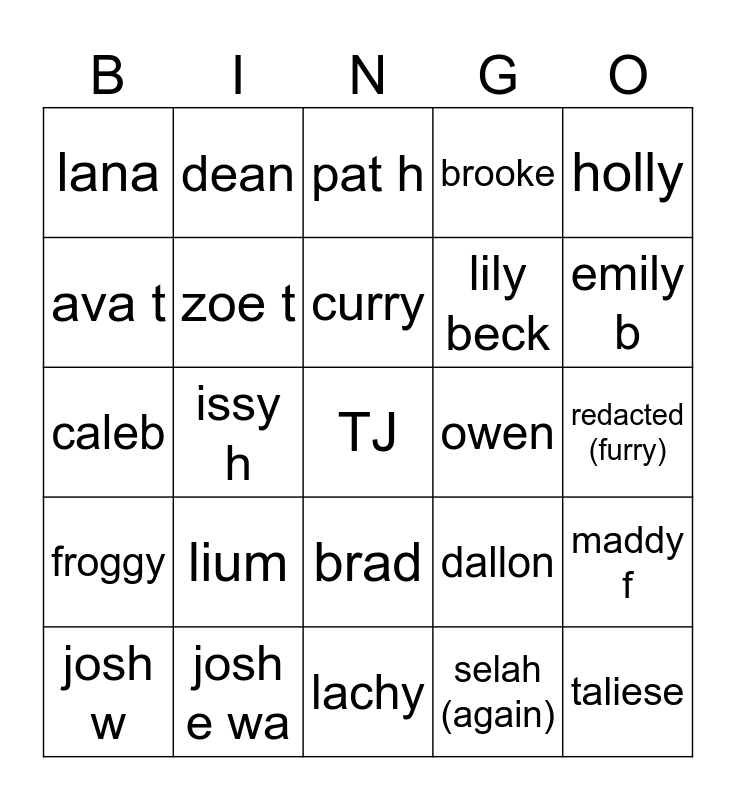 This bingo card has a free space and 24 words: lium, josh e wa, curry, josh w, holly, lana, ava t, dean, owen, brad, lily beck, caleb, dallon, maddy f, zoe t, selah (again), redacted (furry), pat h, emily b, issy h, taliese, froggy, brooke and lachy.