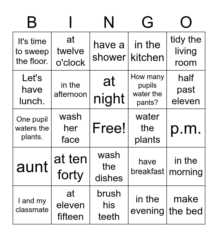 This bingo card has a free space and 24 words: at ten forty, at eleven fifteen, at night, I and my classmate, tidy the living room, It's time to sweep the floor., Let's have lunch., at twelve o'clock, water the plants, wash the dishes, How many pupils water the pants?, One pupil waters the plants., have breakfast, in the morning, in the afternoon, in the evening, p.m., have a shower, half past eleven, wash her face, make the bed, aunt, in the kitchen and brush his teeth.