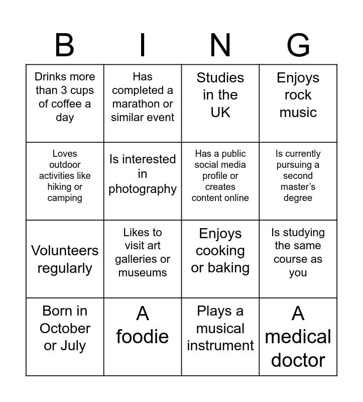This bingo card has 16 words: A foodie, Is studying the same course as you, Studies in the UK, Drinks more than 3 cups of coffee a day, Volunteers regularly, Has completed a marathon or similar event, Enjoys cooking or baking, Plays a musical instrument, Loves outdoor activities like hiking or camping, Is interested in photography, Born in October or July, Enjoys rock music, Likes to visit art galleries or museums, Is currently pursuing a second master’s degree, Has a public social media profile or creates content online and A medical doctor.