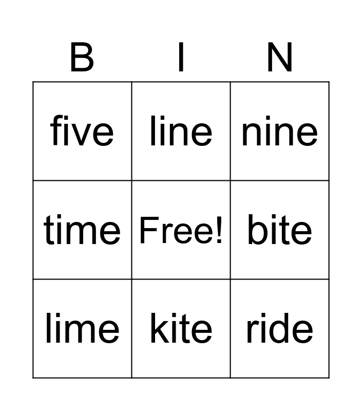 This bingo card has a free space and 12 words: hide, hike, ride, bite, line, nine, kite, bike, five, time, lime and dive.