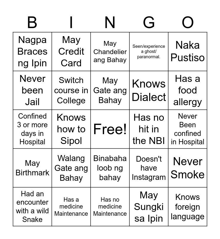 This bingo card has a free space and 24 words: Had an encounter with a wild Snake, Walang Gate ang Bahay, May Gate ang Bahay, May Sungki sa Ipin, Naka Pustiso, Nagpa Braces ng Ipin, May Credit Card, May Chandelier ang Bahay, Has no hit in the NBI, Never Been confined in Hospital, Confined 3 or more days in Hospital, Switch course in College, Doesn't have Instagram, Never Smoke, Never been Jail, Has a medicine Maintenance, Has no medicine Maintenance, Seen/experience a ghost/ paranormal., Has a food allergy, May Birthmark, Knows how to Sipol, Binabaha loob ng bahay, Knows Dialect and Knows foreign language.