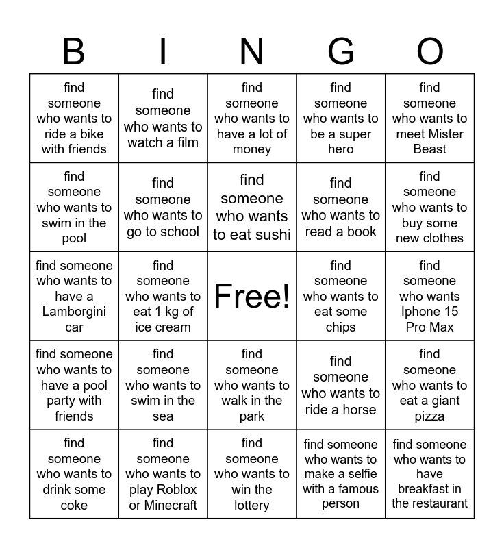 This bingo card has a free space and 24 words: find someone who wants to swim in the sea, find someone who wants to play Roblox or Minecraft, find someone who wants to eat sushi, find someone who wants to drink some coke, find someone who wants to meet Mister Beast, find someone who wants to ride a bike with friends, find someone who wants to swim in the pool, find someone who wants to watch a film, find someone who wants to eat some chips, find someone who wants to walk in the park, find someone who wants to read a book, find someone who wants to have a Lamborgini car, find someone who wants to ride a horse, find someone who wants to eat a giant pizza, find someone who wants to go to school, find someone who wants to make a selfie with a famous person, find someone who wants Iphone 15 Pro Max, find someone who wants to have a lot of money, find someone who wants to buy some new clothes, find someone who wants to eat 1 kg of ice cream, find someone who wants to have breakfast in the restaurant, find someone who wants to have a pool party with friends, find someone who wants to be a super hero and find someone who wants to win the lottery.