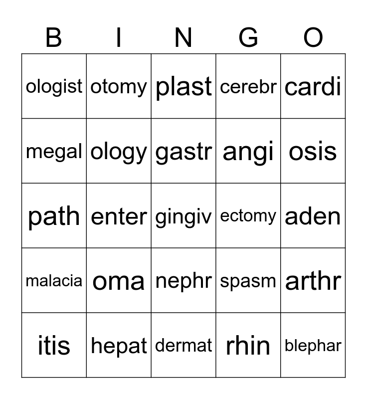 This bingo card has 25 words: oma, dermat, gastr, itis, cardi, ologist, megal, otomy, ectomy, nephr, angi, path, spasm, arthr, ology, blephar, aden, plast, osis, enter, gingiv, hepat, malacia, cerebr and rhin.