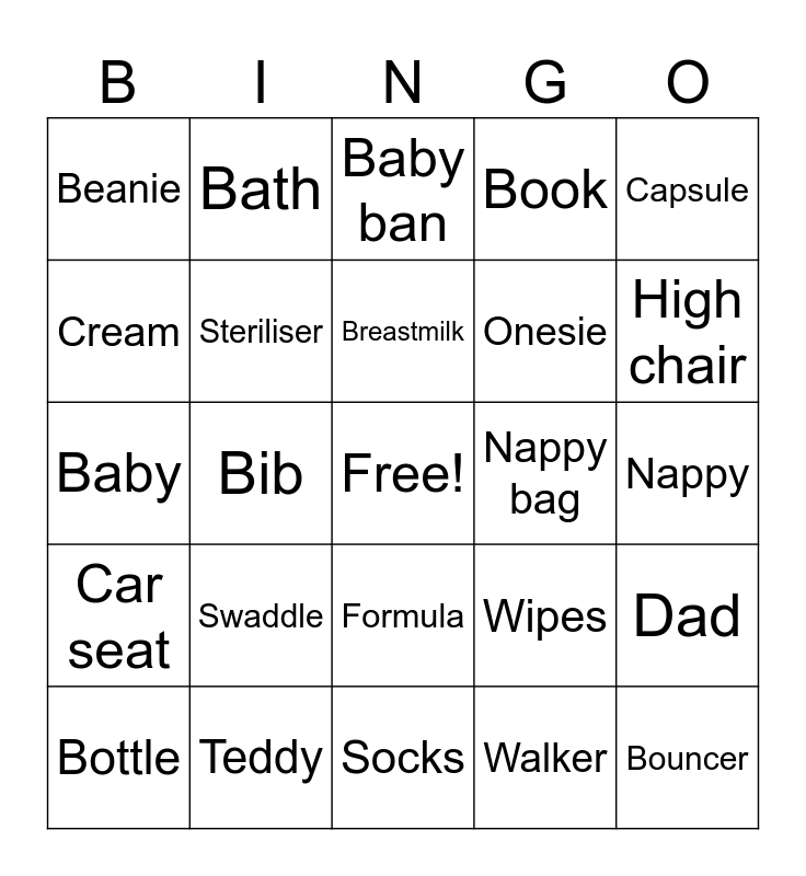 This bingo card has a free space and 39 words: Cot, Blanket, Dummy, Steriliser, Bottle, Formula, Breastmilk, Pram, Capsule, Car seat, Bib, Book, Bouncer, Nappy, Nappy bag, Swaddle, Wrap, Beanie, Teether, Wipes, Cream, Socks, Onesie, High chair, Baby powder, Baby monitor, Sheets, Dummy clip, Burp cloths, Bath, Rattle, Girl, Baby ban, Teddy, Walker, Mum, Dad, Baby and October.