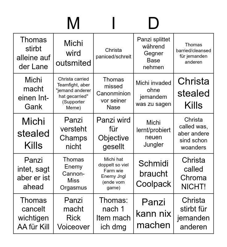 This bingo card has 25 words: Thomas Enemy Cannon-Miss Orgasmus, Thomas: nach 1 Item mach ich dmg, Thomas missed Canonminion vor seiner Nase, Thomas cancelt wichtigen AA für Kill, Thomas barried/cleansed für jemanden anderen, Thomas stirbt alleine auf der Lane, Michi macht einen Int-Gank, Michi wird outsmited, Michi lernt/probiert neuen Jungler, Michi hat doppelt so viel Farm wie Enemy Jngl (ende vom game), Michi invaded ohne jemandem was zu sagen, Michi stealed Kills, Schmidi braucht Coolpack, Christa called Chroma NICHT!, Christa carried Teamfight, aber "jemand anderer hat gecarried" (Supporter Meme), Christa stirbt für jemanden anderen, Christa called was, aber andere sind schon woanders, Christa paniced/schreit, Christa stealed Kills, Panzi versteht Champs nicht, Panzi wird für Objective gesellt, Panzi macht Rick Voiceover, Panzi intet, sagt aber er ist ahead, Panzi splittet während Gegner Base nehmen and Panzi kann nix machen.