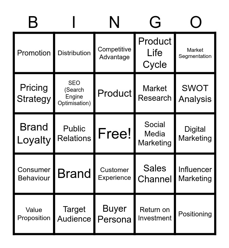 This bingo card has a free space and 24 words: Brand, Target Audience, Product, Value Proposition, Market Segmentation, Promotion, Pricing Strategy, Distribution, Social Media Marketing, Customer Experience, Market Research, Brand Loyalty, Sales Channel, Influencer Marketing, SEO (Search Engine Optimisation), Return on Investment, Digital Marketing, Competitive Advantage, SWOT Analysis, Public Relations, Positioning, Consumer Behaviour, Product Life Cycle and Buyer Persona.
