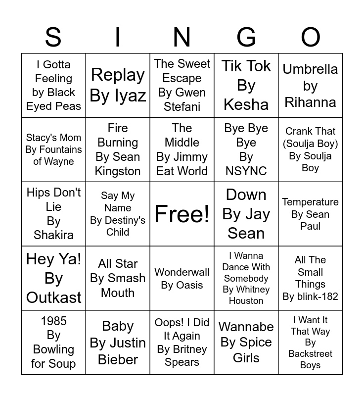 This bingo card has a free space and 27 words: I Wanna Dance With Somebody By Whitney Houston, Crazy In Love By Beyonce & Jay-Z, Bye Bye Bye By NSYNC, Oops! I Did It Again By Britney Spears, Stacy's Mom By Fountains of Wayne, The Sweet Escape By Gwen Stefani, Replay By Iyaz, Hey Ya! By Outkast, Down By Jay Sean, All The Small Things By blink-182, Hips Don't Lie By Shakira, Tik Tok By Kesha, 1985 By Bowling for Soup, Baby By Justin Bieber, Crank That (Soulja Boy) By Soulja Boy, Dynamite By Taio Cruz, Fire Burning By Sean Kingston, The Middle By Jimmy Eat World, All Star By Smash Mouth, I Gotta Feeling by Black Eyed Peas, Temperature By Sean Paul, Wannabe By Spice Girls, Say My Name By Destiny's Child, I Want It That Way By Backstreet Boys, Wonderwall By Oasis, Umbrella by Rihanna and Timber By Pitbull, Kesha.