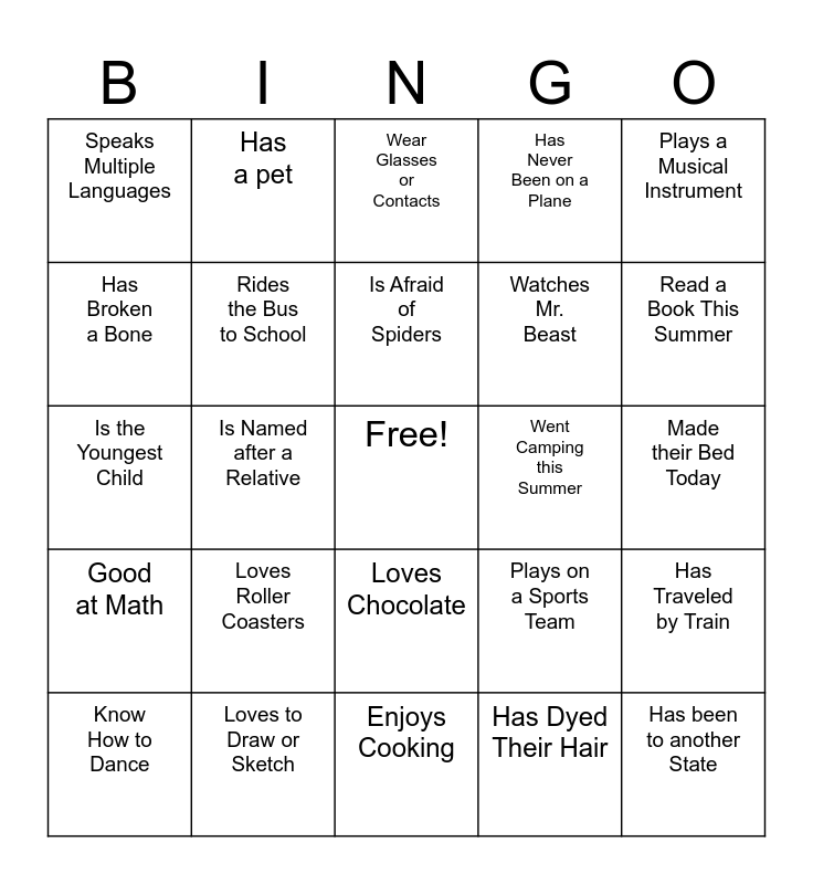 This bingo card has a free space and 29 words: Enjoys Eating Sushi, Loves to Draw or Sketch, Wear Glasses or Contacts, Has more than 2 Siblings, Plays a Musical Instrument, Speaks Multiple Languages, Rides the Bus to School, Is Afraid of Spiders, Went Camping this Summer, Has Traveled by Train, Know How to Dance, Is Named after a Relative, Has Dyed Their Hair, Has been to another State, Is the Youngest Child, Has a Sister, Enjoys Cooking, Plays on a Sports Team, Read a Book This Summer, Good at Math, Loves Roller Coasters, Birthday is in November, Watches Mr. Beast, Made their Bed Today, Has Broken a Bone, Has a pet, Loves Chocolate, Has Never Been on a Plane and Does Not eat Breakfast.