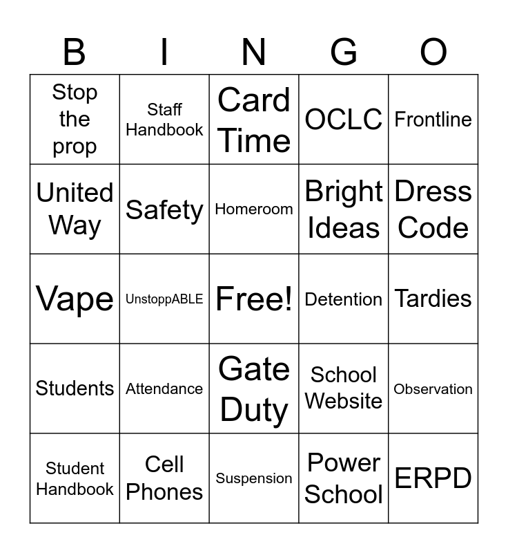 This bingo card has a free space and 33 words: EVOLV, Student Engagement, UnstoppABLE, Board Policies, Students, Safety, Frontline, Student Handbook, Staff Handbook, Raptor, Homeroom, Card Time, Interest, First 10 Days, Detention, Dress Code, Cell Phones, Vape, Attendance, School Website, Gate Duty, Locked doors, Stop the prop, Tardies, Suspension, ERPD, OCLC, Bright Ideas, United Way, Observation, Walkthrough, Power School and Educator Handbook.