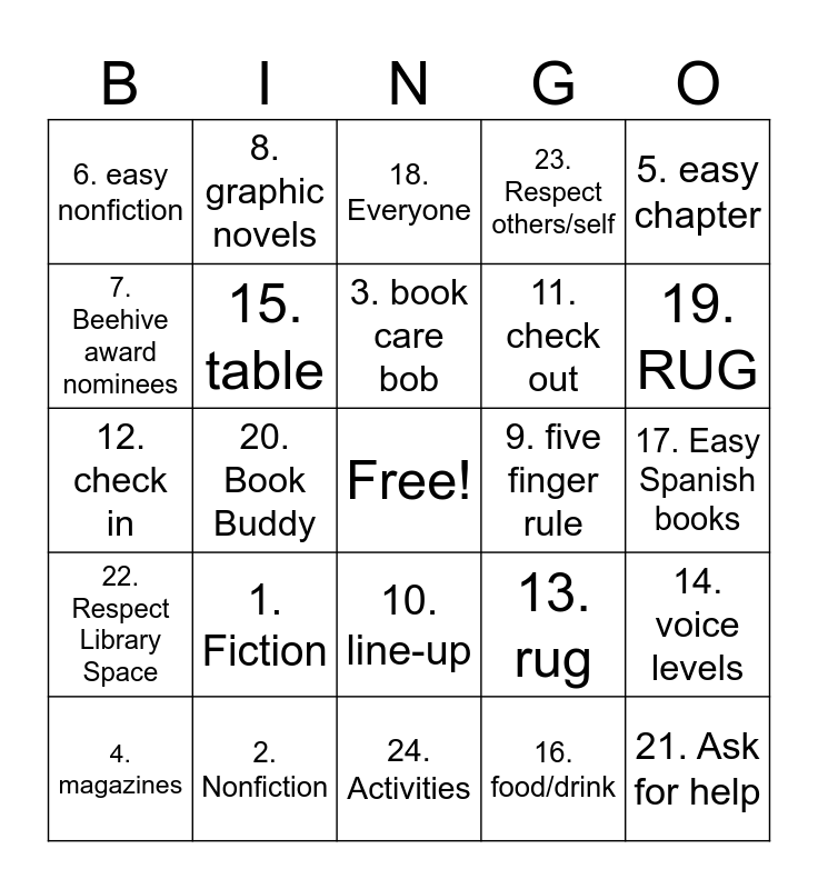 This bingo card has a free space and 24 words: 1. Fiction, 2. Nonfiction, 3. book care bob, 4. magazines, 5. easy chapter, 6. easy nonfiction, 7. Beehive award nominees, 8. graphic novels, 9. five finger rule, 10. line-up, 11. check out, 12. check in, 13. rug, 14. voice levels, 15. table, 16. food/drink, 17. Easy Spanish books, 18. Everyone, 19. RUG, 20. Book Buddy, 21. Ask for help, 22. Respect Library Space, 23. Respect others/self and 24. Activities.