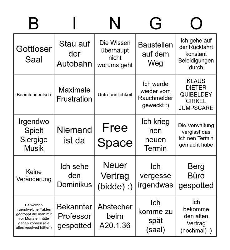 This bingo card has a free space and 24 words: Ich sehe den Dominikus, Bekannter Professor gespotted, Unfreundlichkeit, Es werden irgendwelche Fakten gedroppt die man mir vor Monaten hätte geben können (die alles resolved hätten), Ich gehe auf der Rückfahrt konstant Beleidigungen durch, Gottloser Saal, Beamtendeutsch, Stau auf der Autobahn, Ich krieg nen neuen Termin, Neuer Vertrag (bidde) :), Ich werde wieder vom Rauchmelder geweckt :), Irgendwo Spielt Slergige Musik, Ich vergesse irgendwas, Berg Büro gespotted, Maximale Frustration, Ich komme zu spät (saal), Die Verwaltung vergisst das ich nen Termin gemacht habe, Die Wissen überhaupt nicht worums geht, KLAUS DIETER QUIBELDEY CIRKEL JUMPSCARE, Niemand ist da, Ich bekomme den alten Vertrag (nochmal) :), Keine Veränderung, Baustellen auf dem Weg and Abstecher beim A20.1.36.