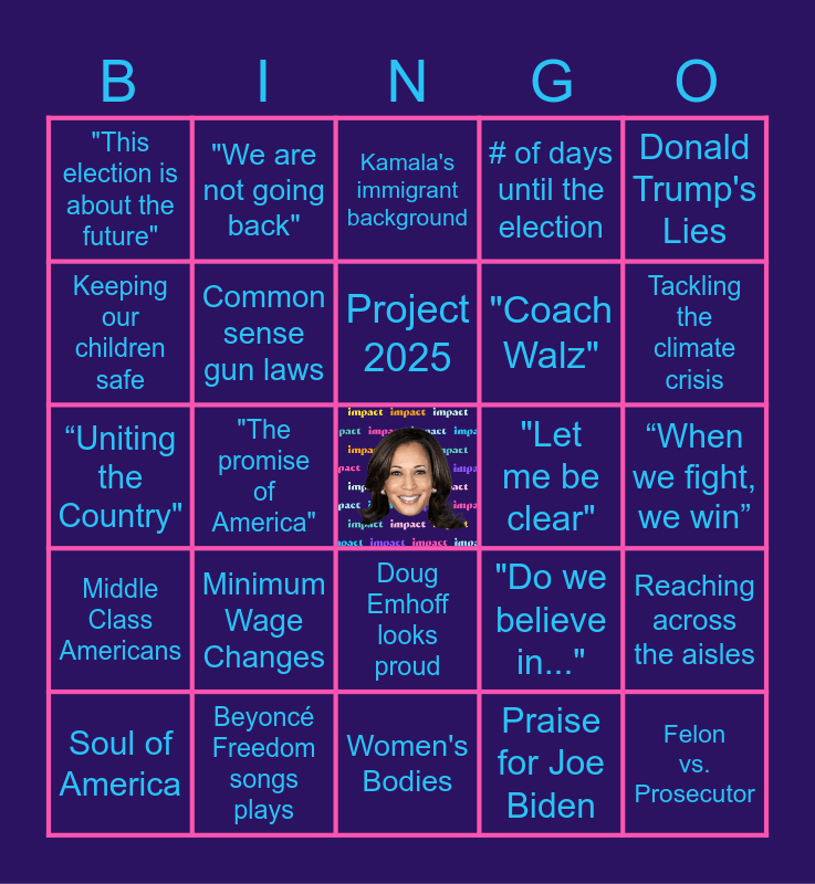 This bingo card has a free space and 34 words: I can't wait to debate, Praise for Joe Biden, Affordable housing, November 5th, Middle Class Americans, Common sense gun laws, Donald Trump's Lies, Soul of America, "We are not going back", Restoring Roe v Wade, Project 2025, Kamala's immigrant background, Kamala laughs, Price Gouging, "Let me be clear", Tackling the climate crisis, Beyoncé Freedom songs plays, “Uniting the Country", Minimum Wage Changes, "Do we believe in...", Doug Emhoff looks proud, Bringing the joy back, "This election is about the future", “When we fight, we win”, Women's Bodies, Felon vs. Prosecutor, # of days until the election, Emotional reaction from the crowd, "Coach Walz", Keeping our children safe, Support for Unions, "The promise of America", Reaching across the aisles and "Let's get to work".