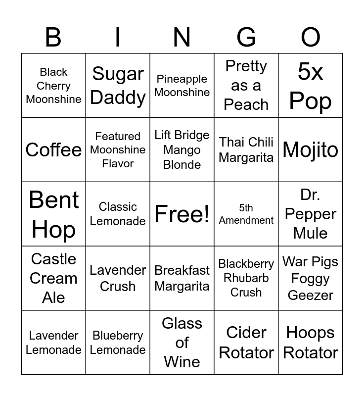 This bingo card has a free space and 39 words: Cucumber Press, Grapefruit Fizz, Coffee, Featured Moonshine Flavor, Lavender Lemonade, Breakfast Margarita, Lift Bridge Mango Blonde, Lavender Martini, 5x Pop, Castle Cream Ale, Classic Lemonade, Pretty as a Peach, Hoops Rotator, Dr. Pepper Mule, 5th Amendment, Lavender Crush, Toppling Goliath Pompeii, Black Cherry Moonshine, 5x Pop, Blackberry Rhubarb Crush, Coffee, Glass of Wine, Thai Chili Margarita, Mojito, Espresso Martini, Ginger Locks Mule, Tavern Margarita, Tavern Mai Tai, Huckleberry Punch, Sugar Daddy, N/A Pineapple Mule, Apple Pie Moonshine, Pineapple Moonshine, Blueberry Lemonade, Cider Rotator, Modelo, War Pigs Foggy Geezer, Bent Hop and Minnesota Mule.