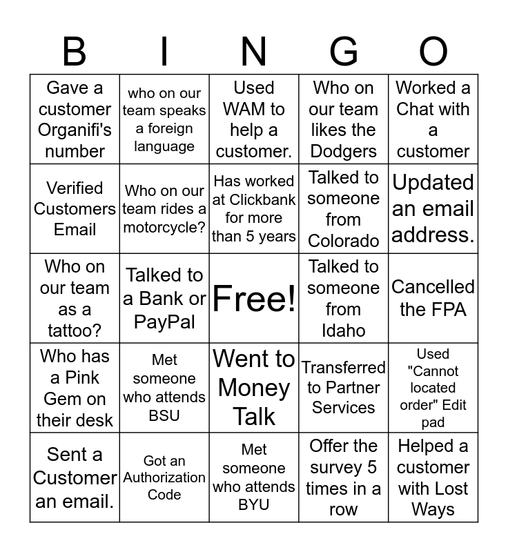 This bingo card has a free space and 24 words: Met someone who attends BSU, Got an Authorization Code, Has worked at Clickbank for more than 5 years, Sent a Customer an email., Worked a Chat with a customer, Gave a customer Organifi's number, Verified Customers Email, who on our team speaks a foreign language, Talked to someone from Idaho, Went to Money Talk, Talked to someone from Colorado, Who on our team as a tattoo?, Transferred to Partner Services, Used "Cannot located order" Edit pad, Who on our team rides a motorcycle?, Offer the survey 5 times in a row, Cancelled the FPA, Used WAM to help a customer., Updated an email address., Talked to a Bank or PayPal, Helped a customer with Lost Ways, Who has a Pink Gem on their desk, Who on our team likes the Dodgers and Met someone who attends BYU.