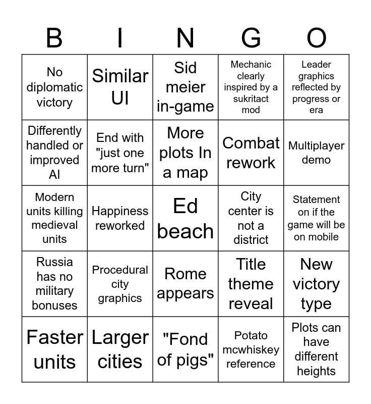 This bingo card has a free space and 24 words: Procedural city graphics, Larger cities, More plots In a map, Faster units, Leader graphics reflected by progress or era, No diplomatic victory, Differently handled or improved AI, Similar UI, City center is not a district, Rome appears, Combat rework, Modern units killing medieval units, Title theme reveal, New victory type, End with "just one more turn", Potato mcwhiskey reference, Statement on if the game will be on mobile, Sid meier in-game, Multiplayer demo, Happiness reworked, Plots can have different heights, Russia has no military bonuses, Mechanic clearly inspired by a sukritact mod and "Fond of pigs".