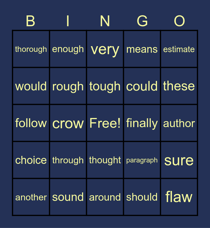 This bingo card has a free space and 28 words: sure, other, could, should, would, very, enough, choice, finally, another, follow, means, sound, around, these, those, through, rough, tough, thought, thorough, though, flaw, crow, author, paragraph, estimate and equation.
