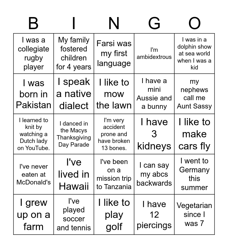 This bingo card has 39 words: Free!, I can speak 4 languages and understand 5, I have dual citizenship in the U.S. and Canada, I speak a native dialect, I grew up on a farm, I've been on a mission trip to Tanzania, I like to mow the lawn, I have never had a piece of chewing gum, I was in a dolphin show at sea world when I was a kid, I've never eaten at McDonald's, I danced in the Macys Thanksgiving Day Parade, I'm ambidextrous, I'm very accident prone and have broken 13 bones., I like to make cars fly, I have 3 kidneys, I've lived in Hawaii, My dad and I have the same birthday, I was a collegiate rugby player, I was on the cover of a magazine, I can say my abcs backwards, I was born in Pakistan, I like to play golf, I have a mini Aussie and a bunny, my nephews call me Aunt Sassy, My favorite person in the world is my 1 year old little sister, I road-tripped around the country this summer, Vegetarian since I was 7, I am ambidextrous, I can say the alphabet backwards, My family fostered children for 4 years, I grew up going trawling for shrimp on my families shrimpboat, I like watching horror movies, Farsi was my first language, I've played soccer and tennis, I have 12 piercings, I have a chicken named Velma, I went to Germany this summer, I learned to knit by watching a Dutch lady on YouTube. and Dad is a drug dealer.