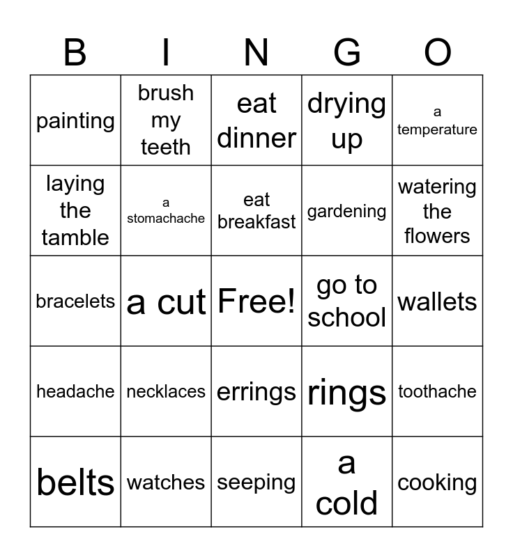 This bingo card has a free space and 32 words: a cold, a cough, a cut, earache, headache, a stomachache, a temperature, toothache, brush my teeth, come home, eat breakfast, eat dinner, get up, go to bed, go to school, watch TV, belts, bracelets, errings, necklaces, rings, umbrellas, wallets, watches, cooking, drying up, gardening, laying the tamble, painting, seeping, washing up and watering the flowers.