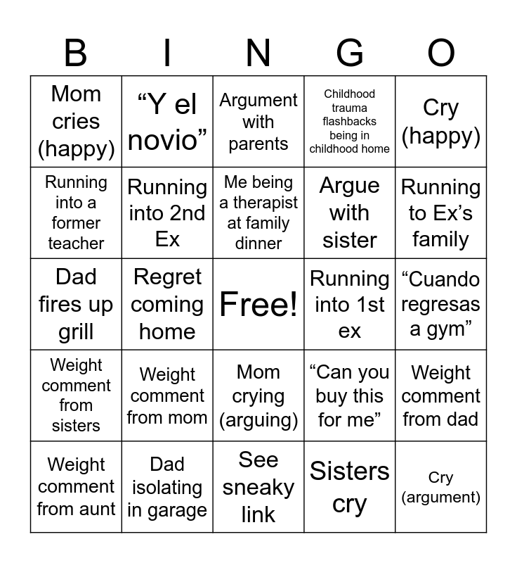 This bingo card has a free space and 24 words: Weight comment from mom, Dad isolating in garage, Me being a therapist at family dinner, Weight comment from aunt, Cry (happy), Mom cries (happy), Running into a former teacher, “Y el novio”, Running into 1st ex, Mom crying (arguing), Argue with sister, Dad fires up grill, “Can you buy this for me”, Weight comment from dad, Running into 2nd Ex, Sisters cry, “Cuando regresas a gym”, Argument with parents, Running to Ex’s family, Regret coming home, Cry (argument), Weight comment from sisters, Childhood trauma flashbacks being in childhood home and See sneaky link.