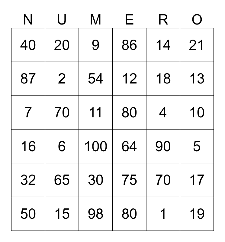 This bingo card has 42 words: 1, 2, 3, 4, 5, 6, 7, 8, 9, 10, 11, 12, 13, 14, 15, 16, 17, 18, 19, 20, 21, 30, 32, 40, 43, 50, 54, 60, 65, 70, 76, 80, 87, 90, 98, 100, 64, 70, 75, 80, 86 and 90.