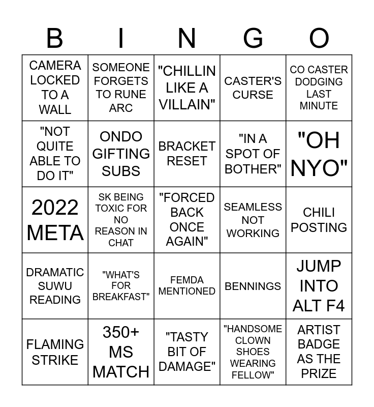 This bingo card has a free space and 24 words: "WHAT'S FOR BREAKFAST", 350+ MS MATCH, BRACKET RESET, FLAMING STRIKE, CO CASTER DODGING LAST MINUTE, CAMERA LOCKED TO A WALL, "NOT QUITE ABLE TO DO IT", SOMEONE FORGETS TO RUNE ARC, SEAMLESS NOT WORKING, FEMDA MENTIONED, "IN A SPOT OF BOTHER", 2022 META, BENNINGS, JUMP INTO ALT F4, ONDO GIFTING SUBS, "HANDSOME CLOWN SHOES WEARING FELLOW", CHILI POSTING, "CHILLIN LIKE A VILLAIN", "OH NYO", SK BEING TOXIC FOR NO REASON IN CHAT, ARTIST BADGE AS THE PRIZE, DRAMATIC SUWU READING, CASTER'S CURSE and "TASTY BIT OF DAMAGE".
