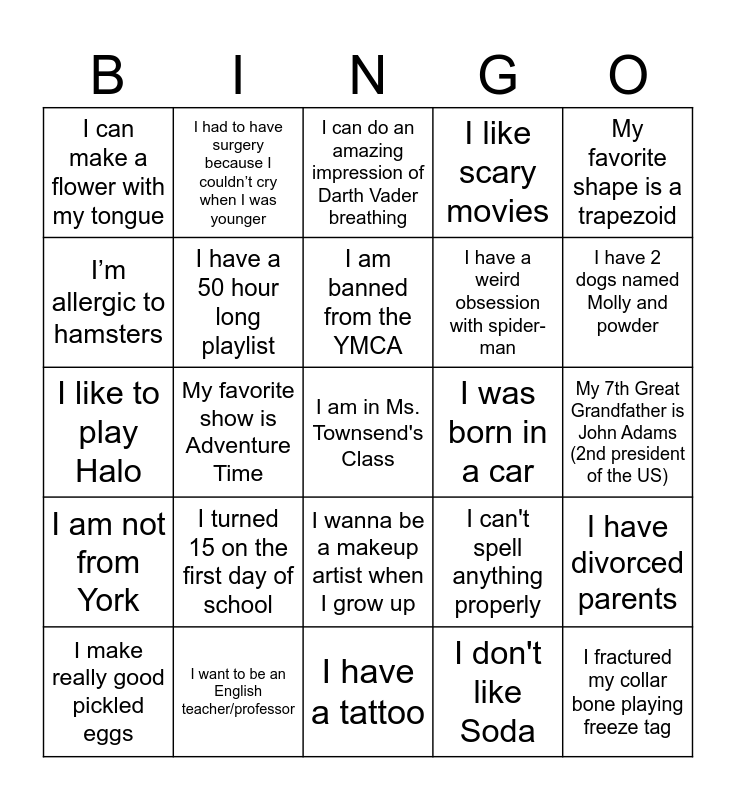 This bingo card has a free space and 24 words: I turned 15 on the first day of school, I want to be an English teacher/professor, I am banned from the YMCA, I make really good pickled eggs, My favorite shape is a trapezoid, I can make a flower with my tongue, I’m allergic to hamsters, I had to have surgery because I couldn’t cry when I was younger, I was born in a car, I wanna be a makeup artist when I grow up, I have a weird obsession with spider-man, I like to play Halo, I can't spell anything properly, I have divorced parents, I have a 50 hour long playlist, I don't like Soda, My 7th Great Grandfather is John Adams (2nd president of the US), I can do an amazing impression of Darth Vader breathing, I have 2 dogs named Molly and powder, My favorite show is Adventure Time, I fractured my collar bone playing freeze tag, I am not from York, I like scary movies and I have a tattoo.