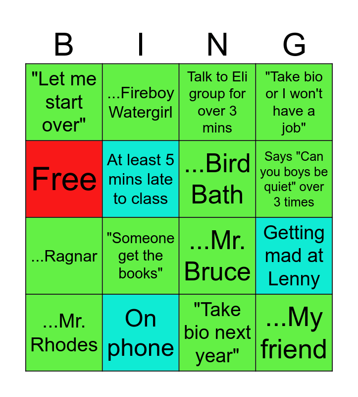 This bingo card has 16 words: On phone, Getting mad at Lenny, Talk to Eli group for over 3 mins, "Let me start over", ...Ragnar, ...Fireboy Watergirl, ...Mr. Bruce, "Take bio next year", Free, At least 5 mins late to class, ...Mr. Rhodes, "Take bio or I won't have a job", "Someone get the books", Says "Can you boys be quiet" over 3 times, ...Bird Bath and ...My friend.