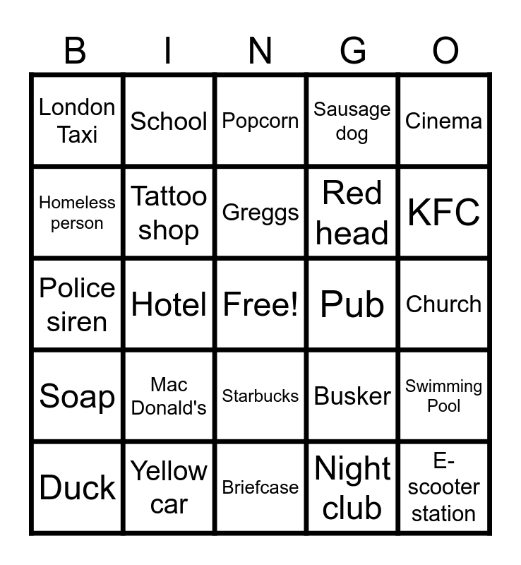 This bingo card has a free space and 24 words: Mac Donald's, Yellow car, Greggs, Duck, Cinema, London Taxi, Homeless person, School, Pub, Starbucks, Red head, Police siren, Busker, Swimming Pool, Tattoo shop, Night club, Church, Popcorn, KFC, Hotel, E-scooter station, Soap, Sausage dog and Briefcase.