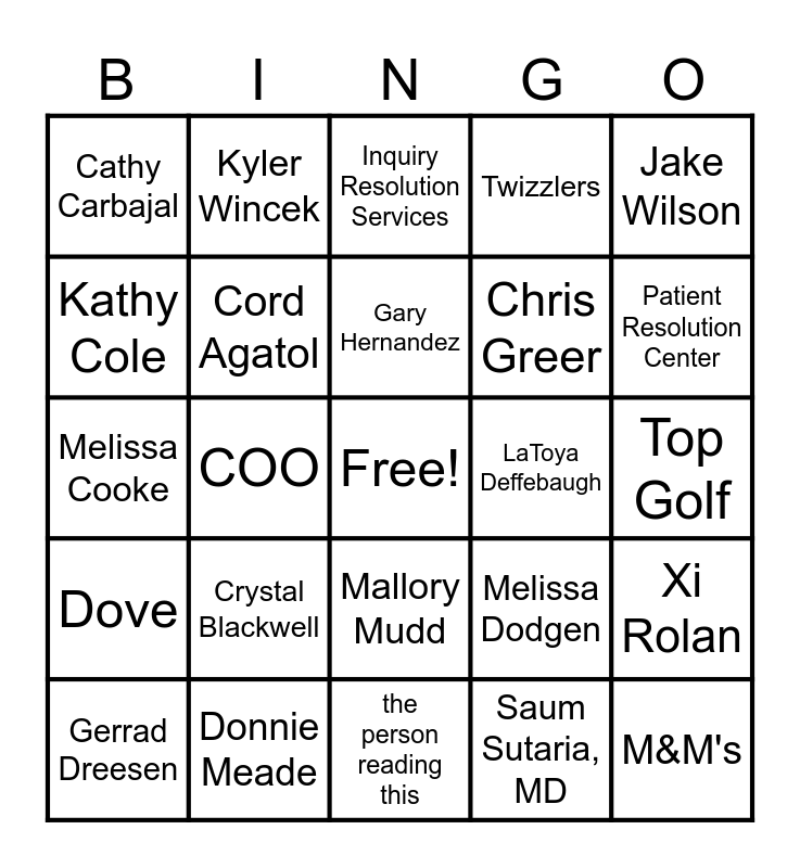This bingo card has a free space and 24 words: Crystal Blackwell, Donnie Meade, Gary Hernandez, Gerrad Dreesen, Jake Wilson, Cathy Carbajal, Kathy Cole, Kyler Wincek, LaToya Deffebaugh, Mallory Mudd, Chris Greer, Melissa Cooke, Melissa Dodgen, Xi Rolan, Cord Agatol, Saum Sutaria, MD, Top Golf, Inquiry Resolution Services, Patient Resolution Center, COO, M&M's, Dove, Twizzlers and the person reading this.