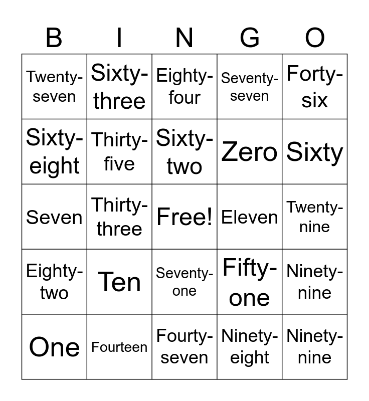 This bingo card has a free space and 24 words: One, Ten, Sixty-two, Ninety-eight, Forty-six, Twenty-seven, Sixty-three, Eighty-four, Eleven, Twenty-nine, Seven, Thirty-five, Fifty-one, Ninety- nine, Sixty- eight, Fourteen, Fourty- seven, Seventy- seven, Sixty, Eighty- two, Thirty- three, Seventy- one, Zero and Ninety- nine.