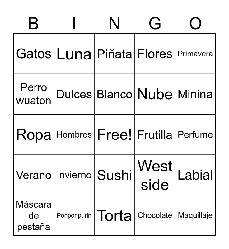 This bingo card has a free space and 30 words: Ponponpurin, Cris MJ, Hombres, Completos, Gatos, Piñata, Dulces, Sushi, Frutilla, Torta, Perfume, Maquillaje, Chocolate, Rizos, Minina, Young sister, West side, Verano, Invierno, Primavera, Ropa, Sol, Luna, Nube, Perro wuaton, Flores, Labial, Máscara de pestaña, Blanco and Pinche.