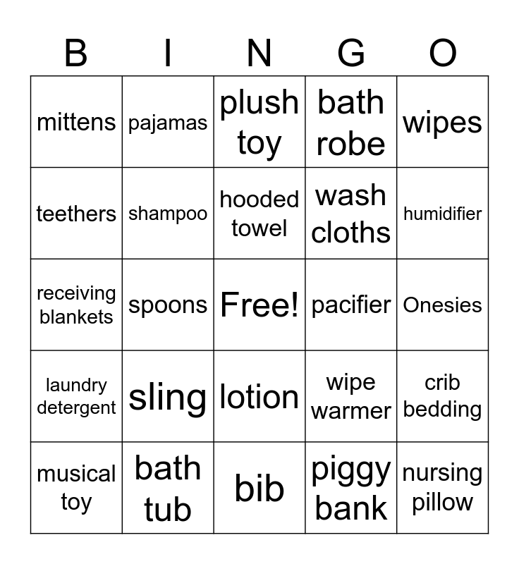 This bingo card has a free space and 54 words: baby monitor, laundry detergent, swaddle wrap, bassinet, lotion, swing or rocker, bath robe, medicine, teethers, bath toys, mittens, thermometer, bath tub, musical toy, utensils, bib, nursing pillow, wash cloths, blanket, Onesies, wipe warmer, book, pacifier, wipes, bottle, pajamas, bottle warmer, photo frame, bouncer, piggy bank, bowl/plate, play mat, burp cloths, car seat, plush toy, cart cover, receiving blankets, crib bedding, cup, shampoo, diaper bag, shoes, diaper cream, diapers, sling, socks, grooming kit, high chair, hooded towel, spoons, humidifier, stroller, jumper and stroller toy.