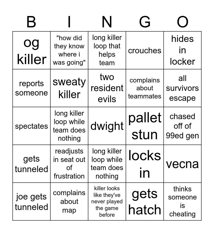 This bingo card has a free space and 24 words: readjusts in seat out of frustration, complains about map, two resident evils, joe gets tunneled, hides in locker, og killer, reports someone, "how did they know where i was going", pallet stun, long killer loop while team does nothing, complains about teammates, spectates, locks in, vecna, sweaty killer, gets hatch, chased off of 99ed gen, long killer loop that helps team, all survivors escape, long killer loop while team does nothing, thinks someone is cheating, gets tunneled, crouches and killer looks like they've never played the game before.