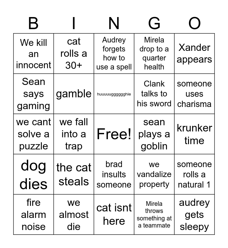 This bingo card has a free space and 24 words: the cat steals, we almost die, huuuuugggggghie, fire alarm noise, Xander appears, We kill an innocent, Sean says gaming, cat rolls a 30+, sean plays a goblin, brad insults someone, Clank talks to his sword, we cant solve a puzzle, we vandalize property, someone rolls a natural 1, gamble, Mirela throws something at a teammate, krunker time, Audrey forgets how to use a spell, someone uses charisma, we fall into a trap, audrey gets sleepy, dog dies, Mirela drop to a quarter health and cat isnt here.