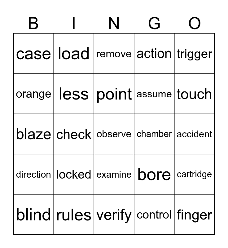 This bingo card has a free space and 24 words: blind, locked, point, control, trigger, case, load, remove, chamber, accident, blaze, less, bore, cartridge, orange, rules, verify, action, touch, direction, check, examine, assume and finger.