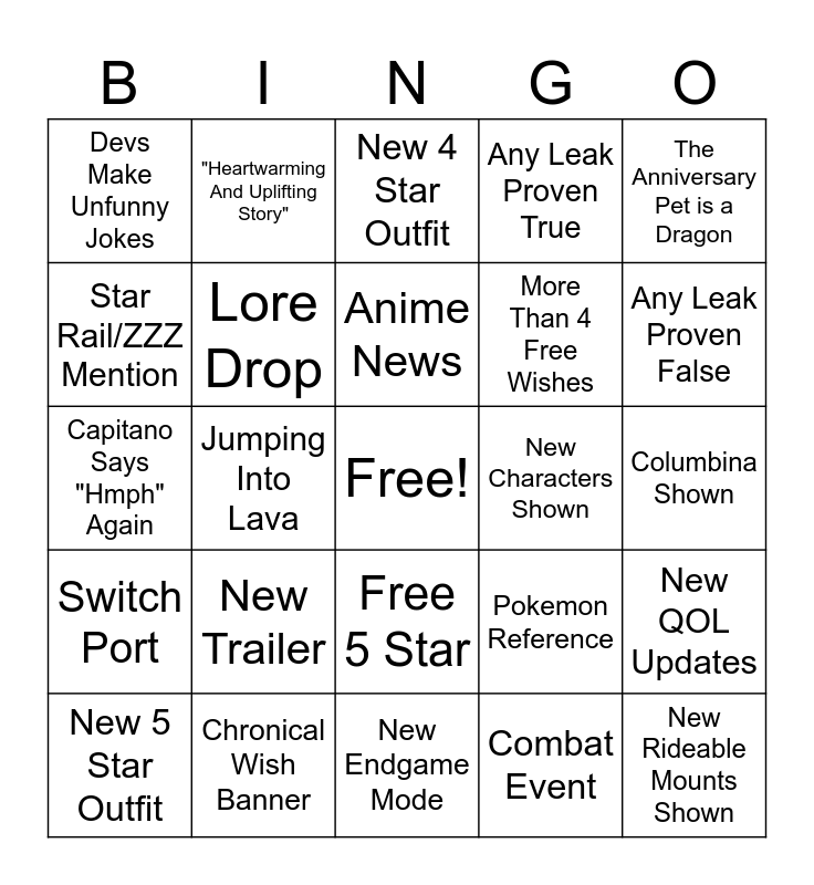 This bingo card has a free space and 24 words: New 5 Star Outfit, New Trailer, Anime News, Combat Event, The Anniversary Pet is a Dragon, Devs Make Unfunny Jokes, "Heartwarming And Uplifting Story", New 4 Star Outfit, New Characters Shown, Columbina Shown, Capitano Says "Hmph" Again, Lore Drop, Pokemon Reference, New QOL Updates, Star Rail/ZZZ Mention, Chronical Wish Banner, New Endgame Mode, Any Leak Proven True, Any Leak Proven False, Switch Port, Jumping Into Lava, Free 5 Star, More Than 4 Free Wishes and New Rideable Mounts Shown.