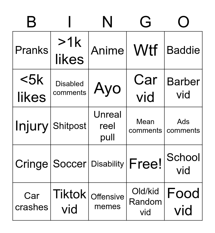 This bingo card has 25 words: Soccer, Offensive memes, Ayo, Car crashes, Baddie, Pranks, <5k likes, >1k likes, Mean comments, Disability, Car vid, Injury, Free!, School vid, Disabled comments, Food vid, Ads comments, Anime, Barber vid, Shitpost, Unreal reel pull, Tiktok vid, Cringe, Wtf and Old/kid Random vid.