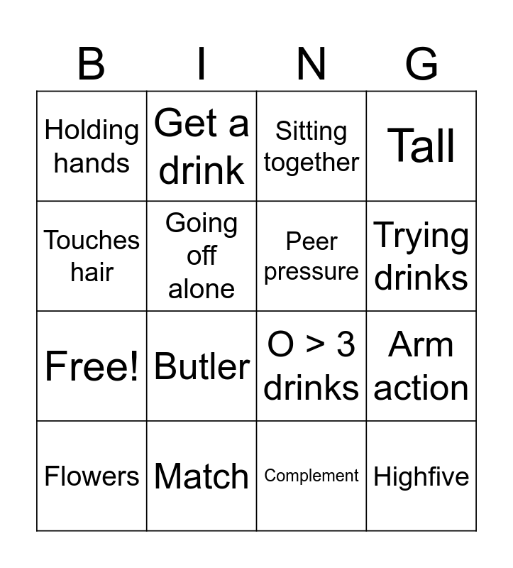 This bingo card has 20 words: Flowers, Photobooth, Sitting together, Arm action, Slowdance, Butler, Complement, Tall, Free!, Get a drink, O > 3 drinks, Trying drinks, Holding hands, Match, Peer pressure, Heels, Touches hair, Going off alone, Trying food and Highfive.